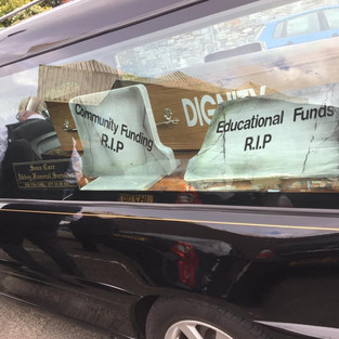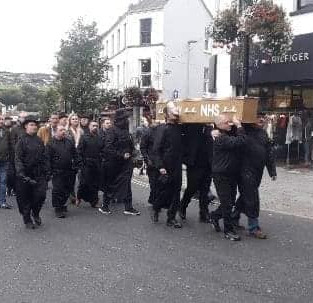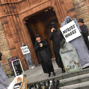In what was a very dramatic event which set off from the Waterside Railway Station to a rally in the Guildhall Square. The cross community procession was absent of party political flags, emblems and banners and replaced by wreaths, headstones and other horror emblems symbolizing the death of the welfare state from community funding to NHS cuts.